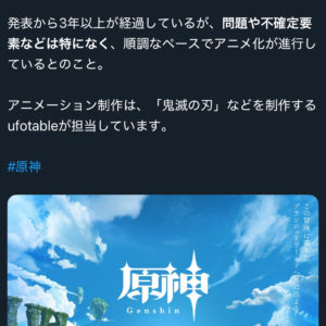 - 【原神】原神アニメ化、問題なく進行中!